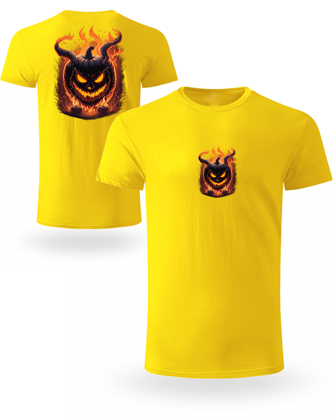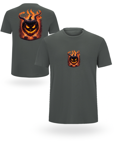 Oslobodi tamnu energiju! 🎃🔥 Ova 100% organska pamučna 🌿 uniseks majica donosi upečatljiv dizajn – mali print naprijed i veliki plameni bundeva pozadi.